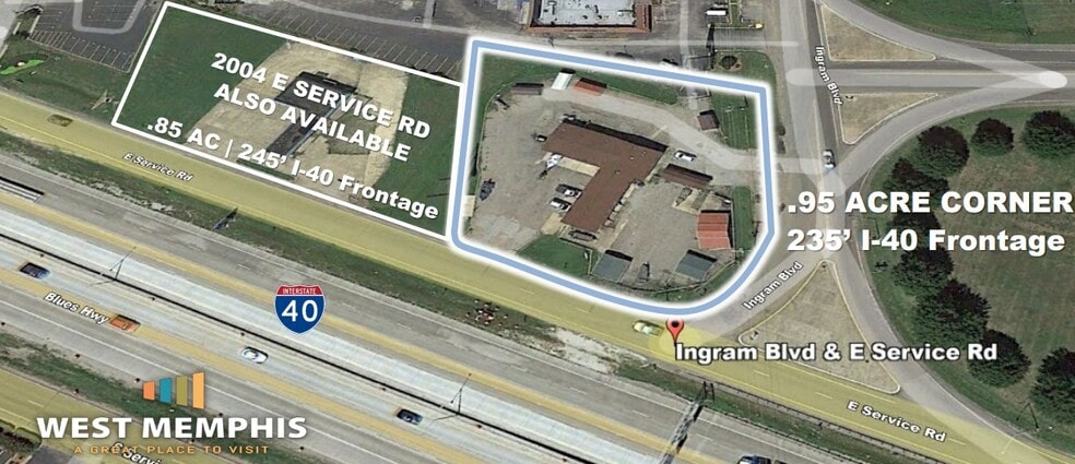 The site is located at the corner of 2008 E Service Rd and Ingram Blvd in West Memphis, Arkansas, positioned directly along the I-40 corridor with approximately 235 feet of interstate frontage. The property consists of two available lots ranging from 0.85 acres up to 1.8 acres. It offers immediate interstate access, high visibility to both car and truck traffic, and connectivity to major regional markets across Tennessee, Arkansas, and Mississippi. The area supports a wide range of commercial uses under C-2 zoning, and essential utilities—including gas, sewer, and other services—are available at the site. Surrounding communities provide access to a broad labor pool and multiple commuting routes.