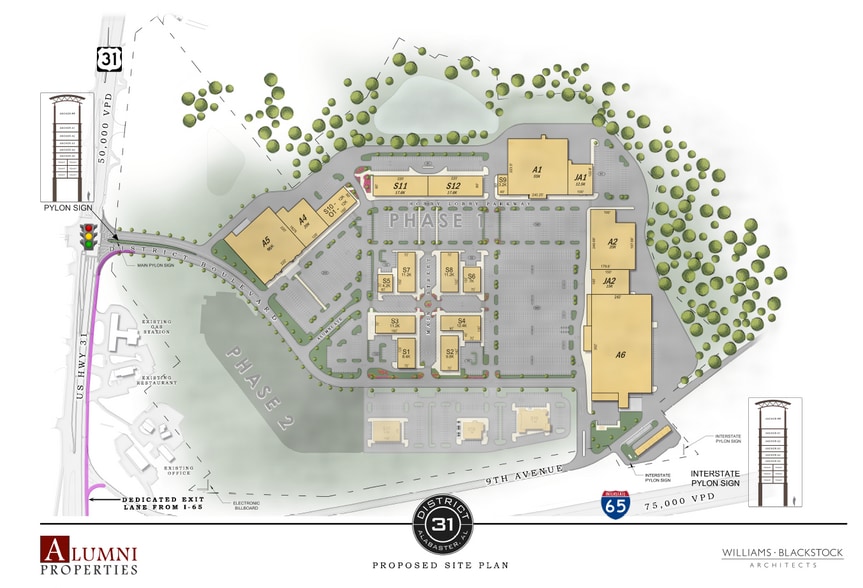 Alabama’s New Exciting Retail Hub New 75-acre Power Lifestyle Center with anchor and retail shop availability Unparalleled visibility from I-65 with over 103,000 VPD and over 40,000 VPD on US Hwy 31 Modern, attractive design featuring a main street plaza
