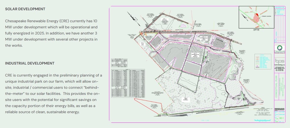 The solar farm is designed to allow commercial tenants to tie directly into the power generation, allowing for substantial savings on their energy capacity costs. By integrating directly into this system, developers can enhance energy efficiency and take advantage of various incentives designed to promote renewable energy. Additionally, there are several commercial lots still available for development on the solar farm property. This presents a rare opportunity to create complementary businesses that can leverage the sustainability and energy cost benefits of being associated with the solar farm. Whether it’s constructing eco-friendly facilities or setting up enterprises that benefit from reduced energy costs, the potential for innovation and profit is significant. The Chesapeake Renewable Energy Solar Farm is located 23 miles south of Salisbury via US Route 13 and 35 miles southwest of Ocean City via US Route 113. This location is squarely in the middle of the two Chesapeake Bay bridges.