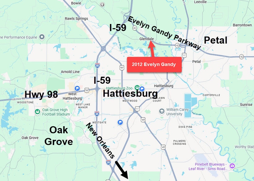 See Marketing Presentation for ESRI research showing what businesses would be successful in this location. The approximately one acre property is vacant land and mostly cleared with 100 feet fronting Highway 42 and 360 feet to 250 feet deep. The parcel is adjacent to The Pet Hospital building and already has an access driveway to Highway 42. Forrest County has no zoning restrictions for this area, and since the property is outside both Hattiesburg and Petal city limits, there are no zoning restrictions. The property is located in Forrest County, Mississippi, just outside the Hattiesburg and Petal city limits, and fronts Mississippi Highway 42 (Evelyn Gandy Parkway), a state highway serving 7 counties that runs east/west from Alabama to Interstate 55 at Hazlehurst, Mississippi. Highway 42 traffic count is approximately 17,000 cars per day in front of the parcel, and the new interchange at Highway 42 and Interstate 59 registers 36,000 to 46,000 cars per day. Highway 42 is the major thoroughfare from Hattiesburg, population 50,000, to Petal, Mississippi, population 11,500, and the interchange at Interstate 59 and Highway 42 allows residents working in Hattiesburg to drive to Petal in 10 minutes.