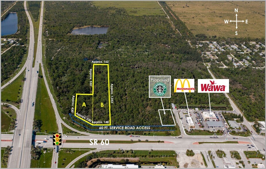 PROPERTY SUMMARY - High Visibility/Access to Interstate and SR 60! - Accessed by SR 60 access easement - Close to Outlet Mall Shopping & Restaurants - High Commercial & Residential Growth Area! - Additional Adjoining Property available, with maximum acreage close to 50 Acres in Commercial and Multi-family land! - Wetland map available. LOT SIZE / PRICES: Parcel A = 2.19 Acres $1,100,000 Parcel B = 4.65 Acres $1,650,000 TOTAL 6.84 Acres $2,750,000 ZONING: CG - Commercial General UTILITIES: County Water & Sewer, FPL TRAFFIC: 30,766 Approx. (2021) R. E. TAXES: $5,278.87 (2022)