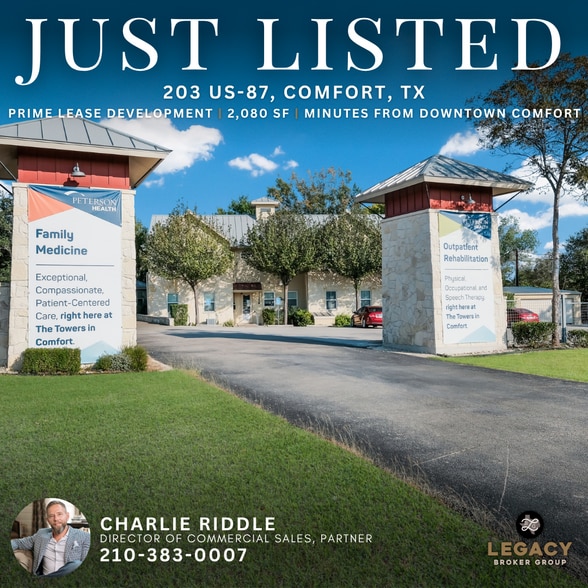 “For Lease” This 2,080sf second generation professional medical office and rehabilitation clinic will be available for lease soon. The property is exceptionally located at “The Towers of Comfort” on Highway 87 just N of I-10. It is minutes from downtown Comfort, 15 minutes from Boerne and 25 minutes from Fredricksburg. Highway 87 is the direct route to and from Fredricksburg to Boerne and Comfort making traffic and visibility exceptional. Please see the attached floor plan for a current clinic layout. The property is fairly turn key and ready for your medical or professional office today! Call Charlie directly at 210.383.0007