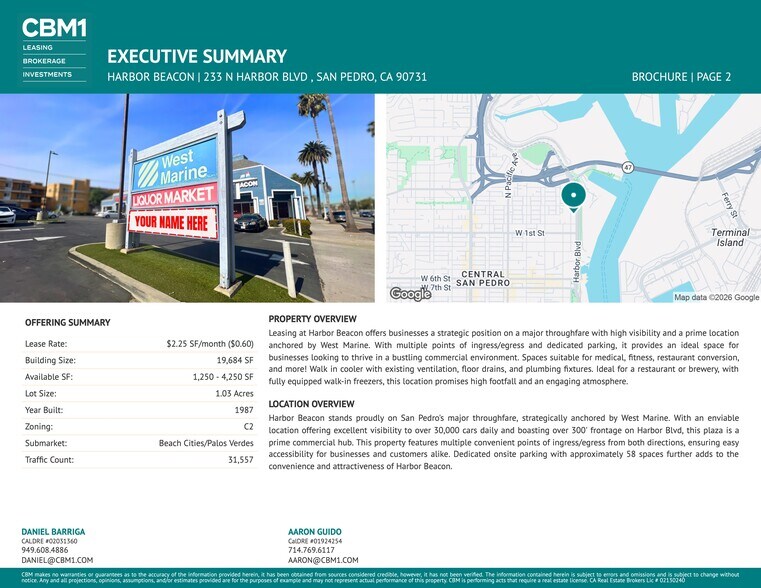 Harbor Beacon stands proudly on San Pedro's major thoroughfare, strategically anchored by West Marine. With an enviable location offering excellent visibility to over 30,000 cars daily and boasting over 300' frontage on Harbor Blvd, this plaza is a prime commercial hub. This property features multiple convenient points of ingress/egress from both directions, ensuring easy accessibility for businesses and customers alike. Dedicated onsite parking with approximately 58 spaces further adds to the convenience and attractiveness of Harbor Beacon. Leasing at Harbor Beacon offers businesses a strategic position on a major thoroughfare with high visibility and a prime location anchored by West Marine. With multiple points of ingress/egress and dedicated parking, it provides an ideal space for businesses looking to thrive in a bustling commercial environment. Spaces suitable for medical, fitness, restaurant conversion, and more! Walk in cooler with existing ventilation, floor drains, and plumbing fixtures. Ideal for a restaurant or brewery, with fully equipped walk-in freezers, this location promises high footfall and an engaging atmosphere.