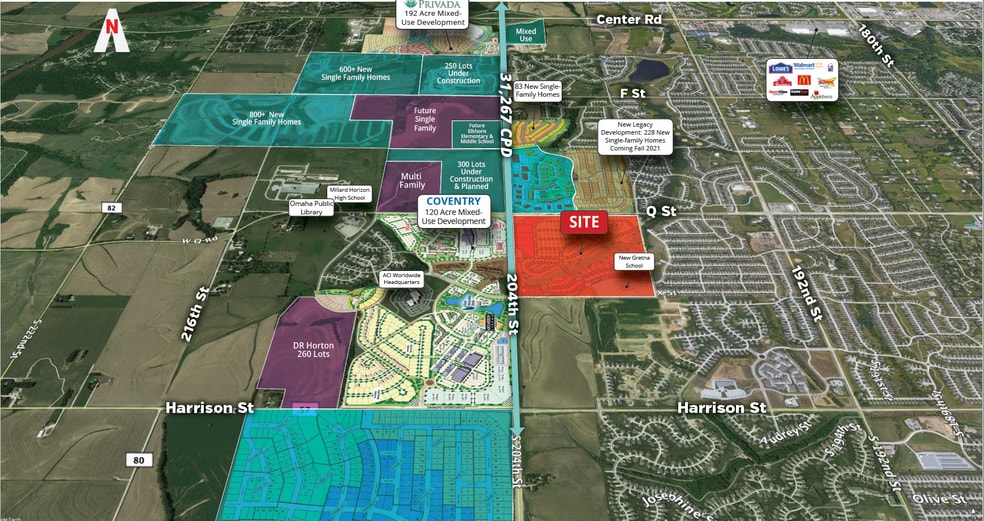 The South Streams Mixed Use Development is positioned on one of Omaha's fastest growing corridor and major intersection of 204th & Q Street. The intersection boasts well over 1,000 new single family homes and major apartment communities on the northeast, northwest, and southeast corners. With two new fully lighted intersections and an additional sip lane exit onto Q Street, the commercials users will benefit from convenient access, as well as significant visibility via the the direct frontage to 204th Street (37,000+ vehicles per day). Lots can be right sized for specific users, ranging from .75 acres - 6 acres. Pads will be delivered with all utilities in place and accessible to each lot.