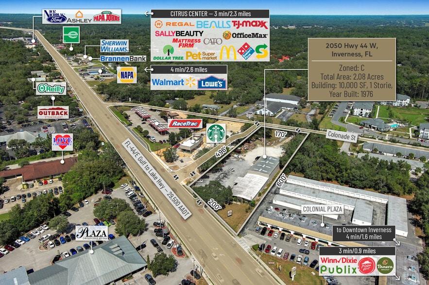 Neighbor STARBUCKS and gain cross accsess on this truly exceptional opportunity to acquire one of the remaining parcels of land along the heavily trafficked SR 44/W Gulf To Lake Highway, with an impressive Average Annual Daily Traffic (AADT) of 30,000 vehicles. Situated just 2 miles to the west of the Historic Downtown Inverness Courthouse Square in Florida, the subject property spans 2.08 acres and carries a GNC commercial zoning designation, which affords a wide spectrum of potential uses. These encompass establishments such as restaurants featuring drive-thru services, banking institutions, retail outlets, car wash facilities, and automotive service centers. Fronting SR 44, the property boasts an impressive 200 feet of highway frontage, offering seamless Ingress and Egress for traffic traveling in both East and Westbound directions. This ease of access is further facilitated by an open median on SR 44, contributing to its exceptional accessibility. Notably, the property also provides "Street-To-Street Access" from SR 44 to Colonnade Street, enhancing its overall convenience.