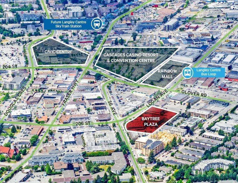Office units are available for lease in Langley City Centre, offering close proximity to the approved Expo Line SkyTrain extension. Baytree Centre is ideally located in the heart of Langley along Logan Avenue and 56 Avenue, directly across from the Langley Cascades Casino, which is set for a 23,000 sq. ft. expansion. The property is surrounded by leading retailers, schools, and amenities, providing immediate access to Fraser Highway and just a ten-minute drive from Highway 1. The proposed terminus station for the extended Expo Line SkyTrain is anticipated at 203 Street, only ten minutes away, making Baytree Centre a highly accessible and attractive option for businesses seeking a central location in a rapidly growing area.