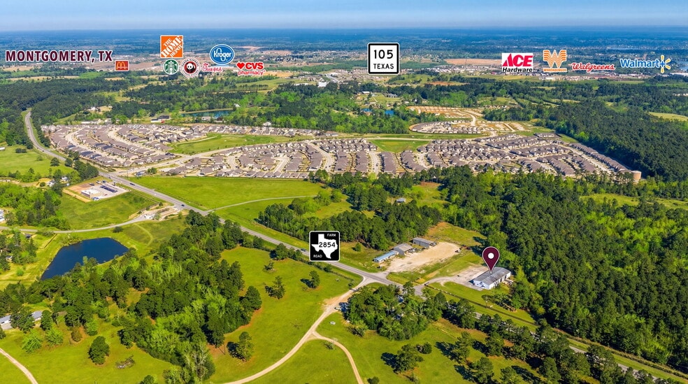 10,800+/- SF commercial property on 3.07 +/- acres at 20820 FM 2854 in Montgomery, Texas. Site offers approximately 500 LF of frontage on FM 2854 with 10,000+ AADT. Building consists of 1,800 SF +/- office/retail space split into two suites and 9,000 SF +/- warehouse. Warehouse is fully insulated and climate controlled with 6 large rollup doors, 16’ header height, 18’ clear height. Three-Phase power to property. Property features electric retractable gate with controlled access and includes a large marquee sign for frontage visibility. Existing auto shop tenant provides in-place income. Located near the new H-E-B under construction, Lake Creek High School, and a new elementary school, with multiple residential developments expanding along FM 2854.
