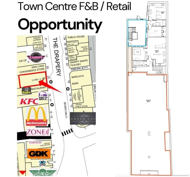 Prime Town Centre location east side of the Drapery among numerous national fast food brands see annotated goad. Close to bus station and new 300 unit Zone student scheme.