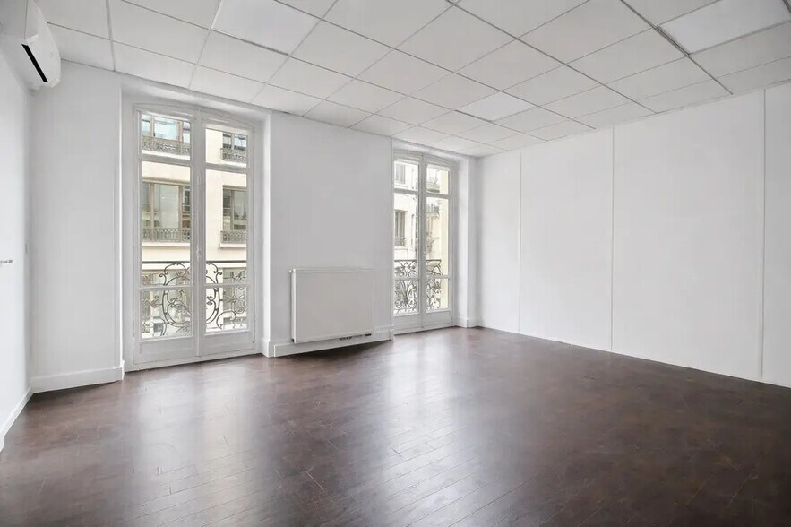 In a corner building located near the Grands Boulevards, LEASEO offers you an air-conditioned and very bright office space for rent. - Currently arranged with 1 entrance, 4 offices, 3 open spaces, 1 kitchen, and restrooms - Quiet and bright premises - Movable partitions - Wooden flooring - Reversible air conditioning - Individual gas heating - Existing IT cabling - Fiber optic - Access control - Information on the risks to which this property is exposed is available on the Géorisques website: www.georisques.gouv.fr Legal and financial conditions: Lease: 3-6-9 years Tax regime: VAT Office tax: €25.77/m²/year Property tax: €25/m²/year Indexation: Annual indexation according to ILAT index Terms: Quarterly payment in advance Security deposit: 3 months excluding tax and charges Fees: