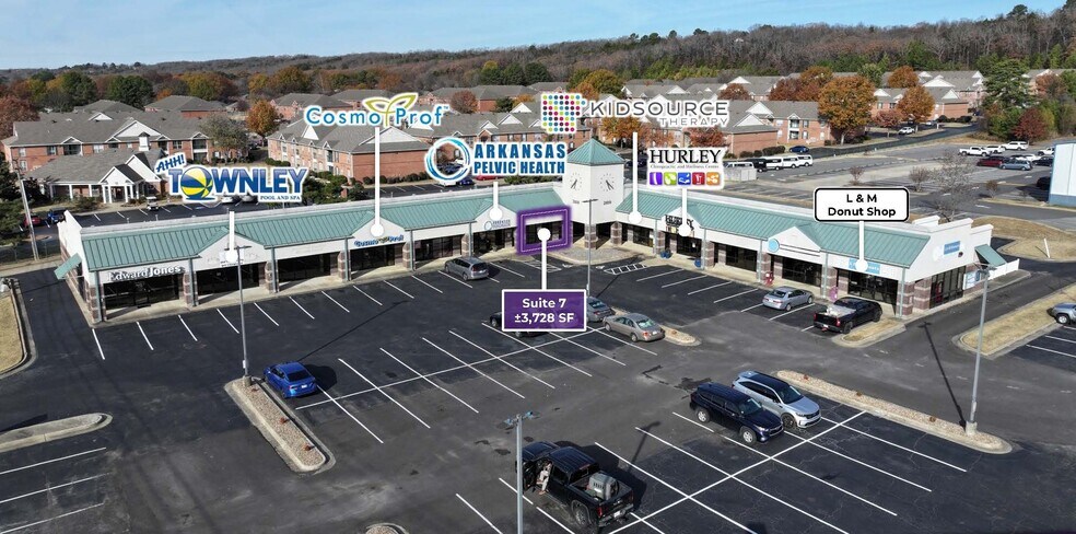 This property is located in a vibrant commercial environment near a diverse mix of restaurants, retail stores, offices, and other businesses. Suite 7 has an existing medical grade finish out with an x-ray room and exam rooms with sinks. Recent updates to the center include new parking lot resurfacing and landscaping. Excellent visibility at the signalized intersection of Donaghey Ave (9,900 VPD) and Meadowlake Rd (2,500 VPD) in a densely populated area. Located near the University of Central Arkansas (1.9 miles), Hendrix College (1.4 miles), and Conway Regional Hospital (2.0 miles). Less than 1 mile to Interstate 40 (46,000 VPD). Nearby retailers include Walmart, Lowe’s, Kum & Go, Dairy Queen, and more. Notable tenants include Edward Jones, The Ride, Hurley Chiropractic, Cosmo Beauty Supply, and L&M Donuts.