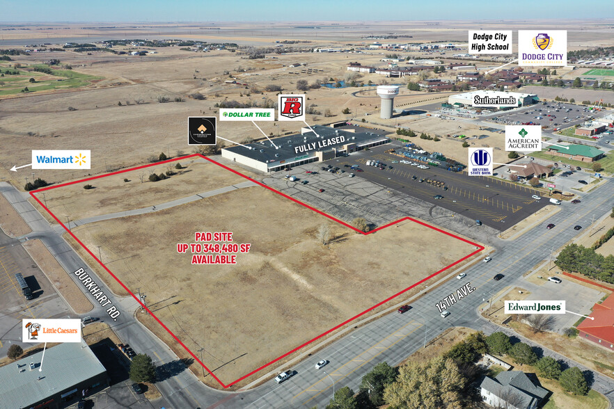 Prime Wal-Mart anchored retail development offering multiple pad sites totaling up to 348,480 SF in the heart of Dodge City’s dominant retail corridor. Adjacent to a fully leased center featuring strong national tenants including Big R and Dollar Tree, driving consistent traffic and visibility. Excellent access and exposure near Hwy. 50 and Wyatt Earp Blvd., providing strong connectivity and high daily traffic counts.
