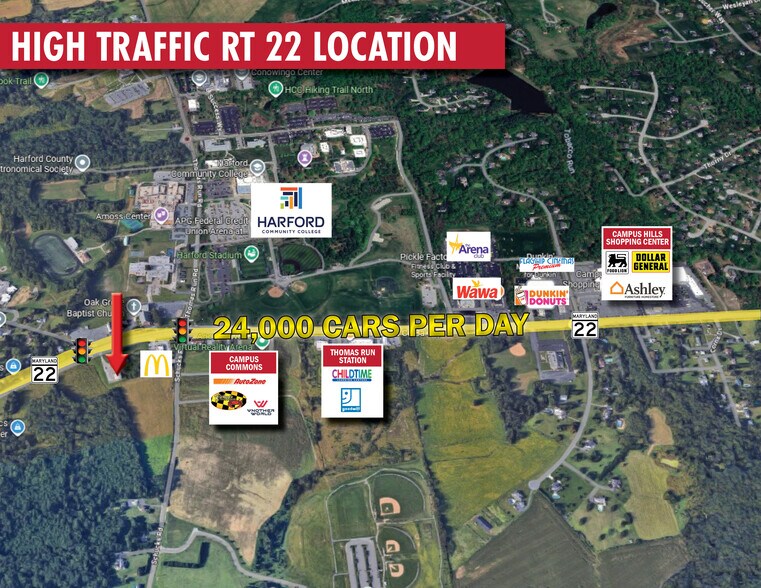 Highly visible retail site for lease! The existing building can be used or the site can be fully redeveloped. The front of the site is available for lease. The rear of the site is currently leased to a highly rated auto mechanic shop. Sits directly next door to McDonald’s Restaurant. Adjacent to the Harford Community College which is a 350+ acre campus with 25 main campus buildings and growing every year. Sitting at the light controlled intersection of E Churchville Rd and Prospect Mill Rd. 140ft of road frontage. The zoning is B2. Surrounded by new development on Churchville Rd. This site sees 30,000+ vehicles per day passing the site and is primed for redevelopment!! Retail Redevelopment Details: Lease rate—Withheld 1,250SF Existing Building +/- .70 Acres at the front of the site 140ft of Road Frontage on E Churchville Rd B2 Zoning Sits at the light controlled intersection of E Churchville Rd and Prospect Mill Rd 24,000 cars per day passing the site on E Churchville Rd 5,800 cars per day on Prospect Mill Rd 82,600 people living within 5 miles Building Details: Built in 1930 Neighbor site to McDonald’s Adjacent to the Harford Community College which is a growing 350+ acre facility Existing Pylon sign near the light controlled intersection Signage available on front of building as well Private Parking lot Front building has its own Well & Septic separate from the rear building Currently laid out as a residential home No Sprinklers