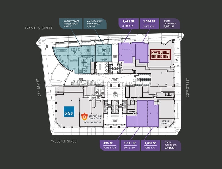 Center 21 is a modern office complex situated in the vibrant Uptown district and at the heart of the Lake Merritt and Uptown markets, offering approximately 6,000 SF of ground floor retail across two distinct buildings—2100 Franklin Street and 2101 Webster Street - all below 690,000 square feet of Class A office space With close proximity to BART and Oakland’s AC Transit, as well as nearby cocktail bars, dining, entertainment and retail options, Center 21 provides an ideal location for tenants who value accessibility, convenience, and an urban lifestyle 2101 Webster | Three 2nd Gen Retail #130-B 493 SF #160 1,511 SF | Former fitness studio, excellent condition #170 1,405 SF | Former cafe with prep kitchen, no hood Can be combined for 2,916 SF 2100 Franklin | 1st Gen Retail - F&B #110 1,688 SF | Offers roll-up door & direct access to lobby #105 1,294 SF Can be combined for 2,982 SF