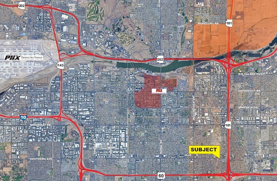 The surrounding area hosts an established mix of medical, retail, and residential uses, creating natural synergies for end users seeking proximity to patient populations, service providers, and regional employers. Nearby freeway access allows rapid connectivity to major destinations across the East Valley, including Arizona State University, Downtown Tempe, Mesa, Chandler, and major employment clusters. The property’s location between Southern Avenue and the 101 positions it within one of Tempe’s most traveled east-west corridors, supporting strong long-term demand and visibility.