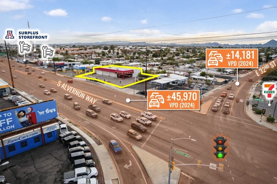 - 45,970 VPD Traffic Counts on S Alvernon Way and Near Signalized Intersection with 14,181 VPD on E 32nd St
