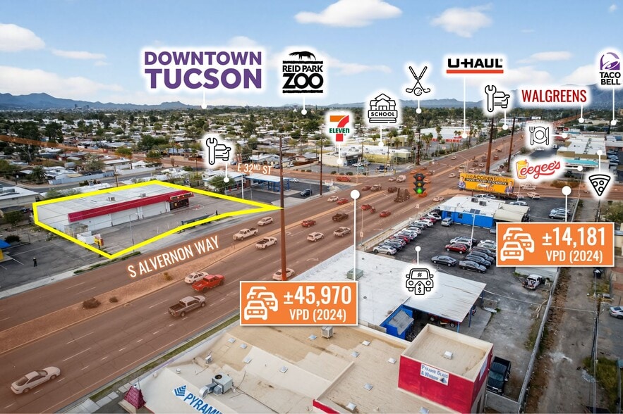 The Property is situated in central Tucson within Pima County, less than 10-minutes from Downtown Tucson and ±15-min from Tucson International Airport (TUS). The site benefits from strong regional connectivity via Interstate 10, which links Tucson to Phoenix (±115-mi northwest), Southern California, and cross-border trade routes with Mexico, reinforcing the city’s role as a key logistics and employment hub in Southern Arizona. S Alvernon Way serves as a major north–south arterial corridor, supporting steady daily commuter traffic and direct access to surrounding residential neighborhoods, retail corridors, and employment centers. The Property occupies a highly visible infill location serving both neighborhood residents and daily commuter traffic within an established urban corridor characterized by dense residential development and long-standing commercial uses. The Property is located ±5-mi from the University of Arizona, which enrolls more than 50,000 students and employs over 16,000 faculty and staff, and ±6-mi from Davis-Monthan Air Force Base, one of the region’s largest and most stable employment anchors. The Property serves a robust demographic base with ±79,206 within ±3-mi and more than 285k residents within ±5-mi. This strong consumer base, combined with Tucson’s ongoing growth and regional connectivity, reinforces the Property’s long-term value.
