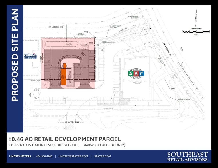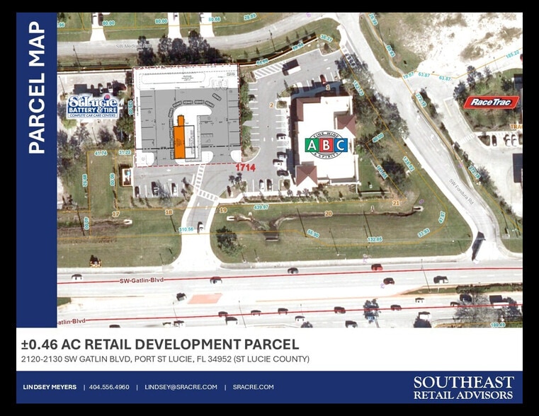 0.46 AC parcel that measures 160' x 125' with additional land area in front of the parcel with cross-access and parking. Site has an eastbound left-in on Gatlin Blvd shared with ABC Fine Wine & Spirits. See attached plan for more details.