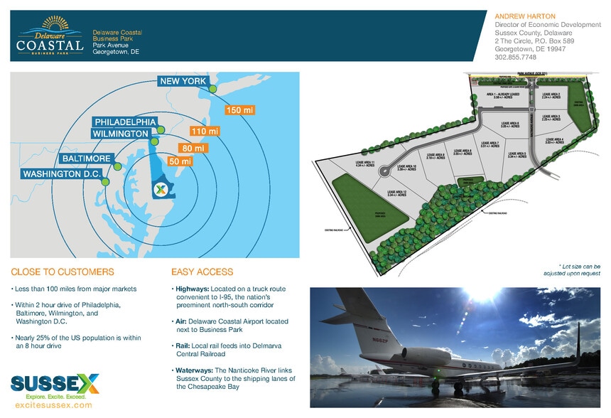 Shovel-Ready site with Light Industrial Zoning Less than 100 miles from major markets Within 2-hour drive of Philadelphia, Baltimore, Wilmington, and Washington D.C. Nearly 1/4 of the US population is within an 8 hour drive Highways: Located on a truck route convenient to I-95, the nation’s preeminent north-south corridor Air: Delaware Coastal Airport located next to Business Park Rail: Local rail feeds into Delmarva Central Railroad Waterways: The Nanticoke River links Sussex County to the shipping lanes of the Chesapeake Bay Lot size can be adjusted upon request Full sewer and water service, electric, communications, and natural gas service available Low County property tax structure and advantageous State tax structure