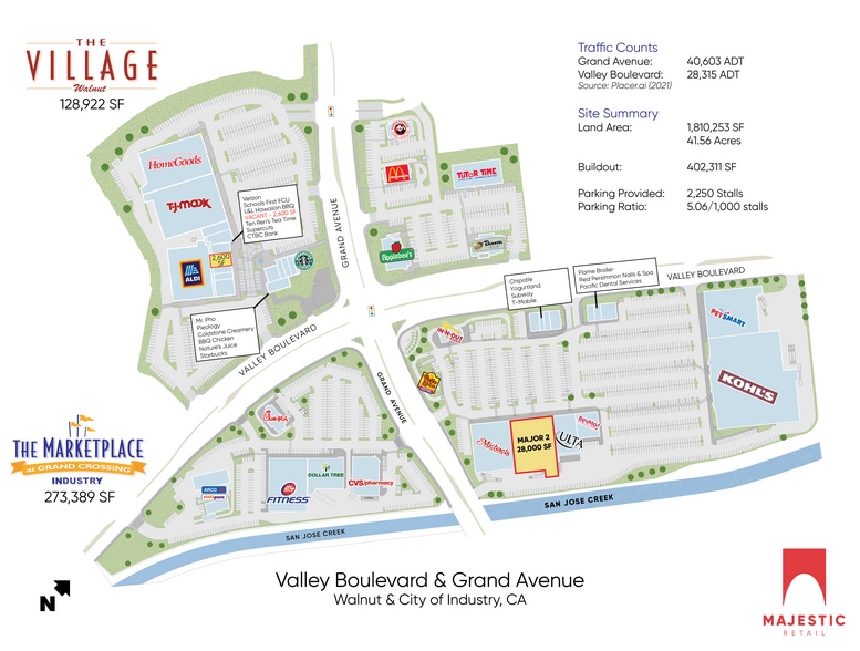 The Marketplace at Grand Crossing is a ±273,389 S.F. regional retail center at the S.E.C. and S.W.C. of Grand Avenue and Valley Boulevard in the City of Industry. The project includes ULTA, Michaels, Kohl's, PetSmart, BevMo!, In-n-Out, 24 Hour Fitness, CVS, and several other top-tier tenants. As the retail hub of the trade area, The Marketplace has outstanding access from the Pomona (60) Freeway and signalized entrances from both major streets. Families from the high-income communities of Walnut and Diamond Bar, students from Mt. San Antonio College (62,000+ enrollment) and Cal Poly Pomona (26,000+ enrollment), along with 15,000+ employees from the many neighboring businesses all shop at The Marketplace on a daily basis.