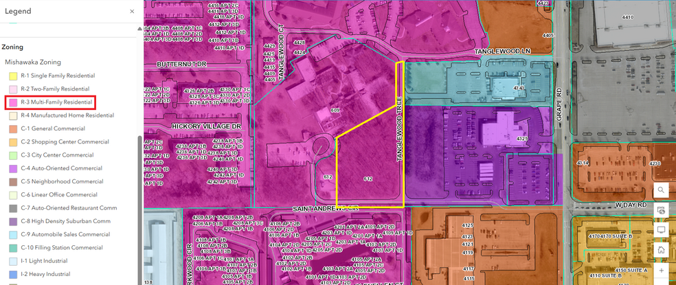 Excellent multi-family or office development opportunity nestled on Tanglewood Trace just off heavily traveled Grape Road (23,500 cars daily) in the heart of the Main St/Grape Rd Shopping/Retail Corridor. With 2 separate access points to Grape Road on the North and South side of the property, and the convenience of several major roadways nearby (Grape Rd, Main St, Edison Rd, Day Rd, Douglas Rd, SR 23, and more), the centralized location allows for easy access to much of the area's desired locations. The property is only 2 miles from the University of Notre Dame, 2 miles from the University Park Mall (Simon Mall), 2.5 miles from Downtown Mishawaka and the beautiful Mishawaka Riverwalk corridor, 4 miles from charming Howard Park and Downtown South Bend, 4.5 miles from the IN-Toll Road interchange at US-31/N Dixie Way, 5 miles from the IN-Toll Road interchange at IN-331/Capital Ave, and 7 miles from the South Bend International Airport. Zoned R-3: Multi-Family. Taxes: $8,128.38. Tax Year: 2023.