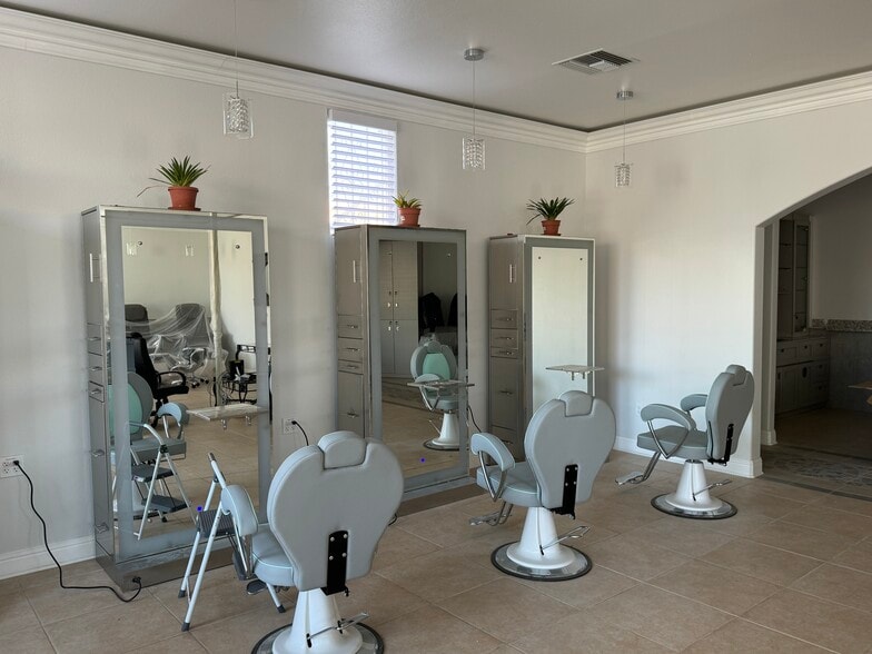 The salon includes 4 work-stations for hair, 4 work-stations for nails, 5 pedicure chairs with foot spas, 3 shampoo stations, 3 hair dryers, private facial room, 2 semi-private facial stations, reception area and desk, public restroom, employee restroom, employee break area and laundry area.