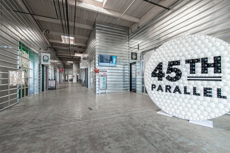 Located on the main corridor at the 45th Parallel, this space has an open floor plan with polished cement flooring, 18' ceiling w/skylight, a glass rollup door, and central HVAC. Common area restrooms.