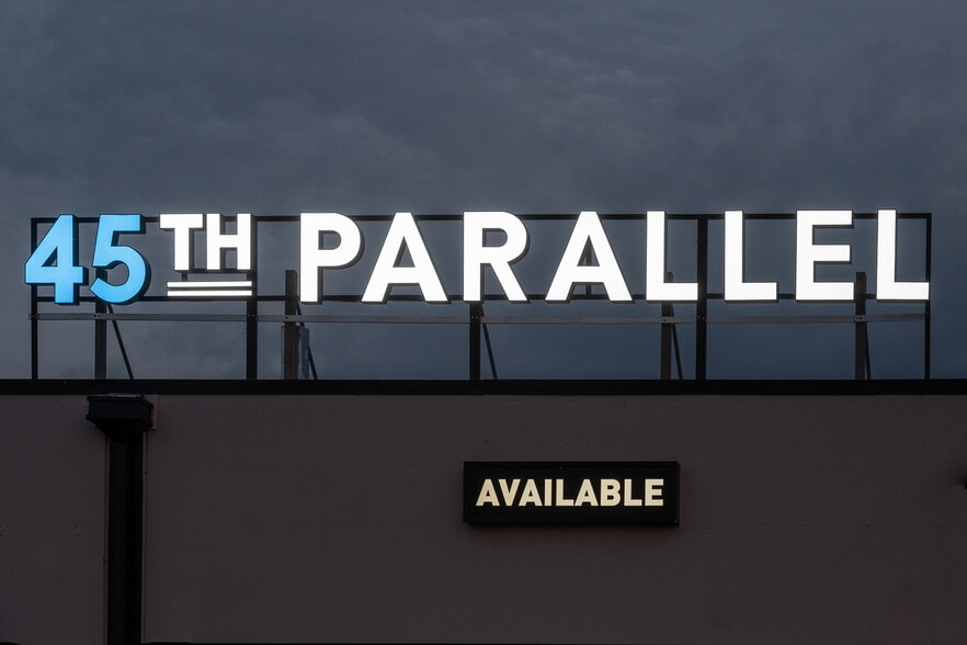 Beautiful endcap suite in the north building at the 45th Parallel. Open floor plan with an abundance of windows and natural light, a front retail area and a mezzanine loft. A built in counter with sink, glass roll up door, 18' ceilings and cement flooring. Common area restrooms nearby.