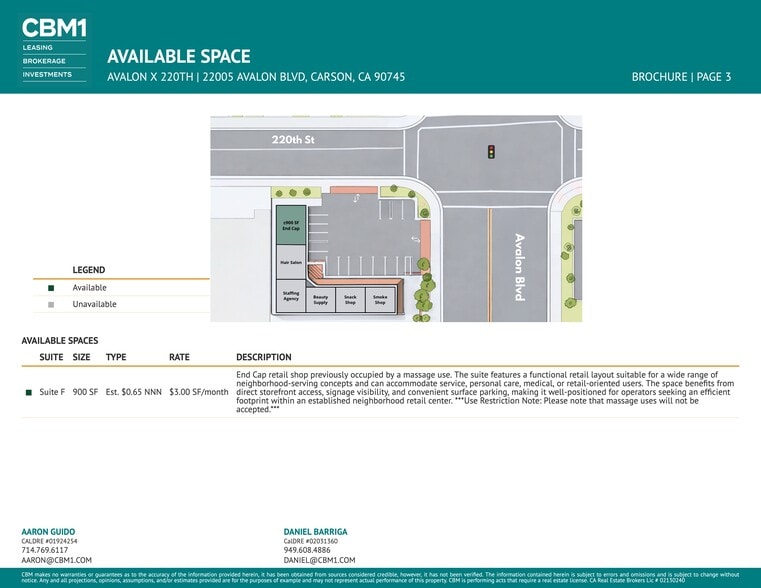 Avalon x 220th is a well-located neighborhood strip center totaling approximately 5,225 square feet, offering investors and owner-users stable in-place income with long-term upside. The property is occupied by a mix of service-oriented retail tenants that benefit from consistent daily demand generated by the surrounding residential base. Featuring a straightforward strip-center layout, surface parking, and strong street frontage along Avalon Boulevard, the center provides ease of operation, solid visibility, and durable tenancy. This is an attractive opportunity to acquire a stabilized neighborhood retail asset with future value-add potential through rent growth, lease restructuring, or repositioning. Located at the signalized intersection of Avalon Boulevard and 220th Street in Carson, California, Avalon x 220th benefits from exposure along a primary north-south commercial corridor serving the greater South Bay. The immediate area is characterized by dense residential neighborhoods, steady daytime employment, and limited competing retail, supporting long-term demand for neighborhood-serving uses. Avalon Boulevard provides convenient access to nearby arterials and regional freeways while maintaining strong local traffic patterns. The combination of visibility, accessibility, and an established retail environment makes this location highly functional for service, medical, and personal care tenants.