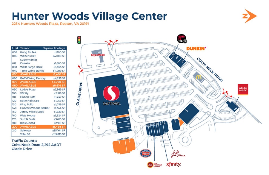 About Hunters Woods Village Center Hunters Woods Village Center in Reston, Virginia is a well-positioned neighborhood retail and service hub anchored by everyday essentials such as Safeway, Rite Aid, Jersey Mike’s, Dunkin’, and a mix of local service tenants and eateries, all organized around a walkable plaza format that serves the surrounding residential community. The center sits on approximately 12.8 acres of non-residential land with direct access from Glade Drive and Colts Neck Road, making it a convenient destination for residents within South Reston. Within a one-mile radius of the property, there are nearly 20,000 residents and over 7,300 households, with median household incomes approaching $163,000 and daytime population exceeding 20,000, while the three-mile trade area supports nearly 120,000 people and household incomes above $205,000. This demographic profile reflects a mix of established households and active adults with strong spending power and a high rate of college education. Reston itself is a mature, mixed-use community founded on principles of integrated living connecting residential, retail, office, and recreational space with as Hunters Woods is one of its original village centers. The broader market around the center benefits from a stable population base, a high average age in the late 30s, and housing values that reflect the strength of the local real estate market, with median home values well above regional averages. The presence of community assets such as the Reston Community Center, nearby senior living developments, and convenient transit options contribute to consistent foot traffic and ongoing neighborhood activity. With strong demographics, solid household incomes, and a location within the greater Washington-Arlington-Alexandria metro area, Hunters Woods Village Center continues to play an important role as a neighborhood-serving retail destination within Reston’s larger economic framework. About Fairfax County Fairfax County, Virginia is one of the most dynamic and economically influential counties in the United States, known for its strong workforce, high educational attainment, and robust business environment. Located just outside Washington, D.C., the county is home to major federal agencies, Fortune 500 companies, and a thriving technology and defense sector. Its excellent transportation network—including Metro access, major highways, and proximity to Dulles International Airport—supports both regional and global connectivity. With top-rated schools, diverse communities, and a high quality of life, Fairfax County continues to be a premier destination for residents, employers, and long-term investment.