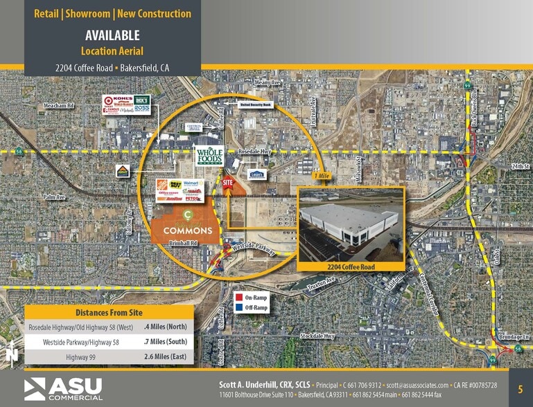 Positioned along Coffee Road—one of the most heavily trafficked retail corridors in Bakersfield—this ±90,959 square foot new construction building offers a rare opportunity for big box, showroom, and specialty retail users seeking maximum visibility, access, and co-tenancy synergy. The property is located within Bakersfield’s premier retail trade area, immediately adjacent to the region’s dominant power center featuring national anchors including Walmart, Target, Lowe’s, Home Depot, Best Buy, and other high-performing retailers . This concentration of major tenants drives consistent consumer traffic and establishes the location as a primary retail destination for the Central Valley. The site benefits from direct frontage and signage along Coffee Road, delivering exceptional exposure to strong daily traffic counts and providing retailers with high-impact brand visibility. Additionally, the project sits within the Bakersfield Commons mixed-use development, a rapidly expanding retail and commercial hub that continues to attract new development and long-term demand. Designed with flexibility in mind, the building can accommodate a wide range of uses including big box retail, furniture and home goods showrooms, fitness concepts, specialty retail, and experiential users. The combination of modern construction, strong demographics, and proximity to major transportation corridors—including Westside Parkway and Highway 99—positions this property as a premier retail opportunity in Bakersfield. With limited availability of large-format retail space in this corridor, this offering provides tenants the ability to secure a high-visibility location in one of the most active and established retail nodes in the market.