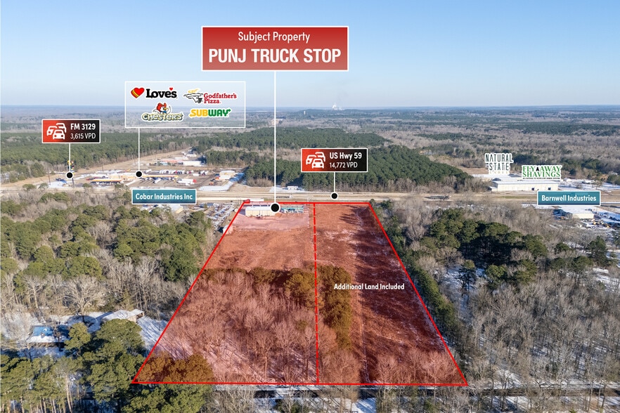 Punj Truck Stop presents a rare owner-user opportunity along US Highway 59 in Queen City, TX, within the Texarkana MSA. The 11.7-acre site features a 6,000 SF truck stop and restaurant with no existing fuel contract, allowing buyers full operational control and flexibility to rebrand or renegotiate supply. Positioned on a high-traffic corridor with ±14,772 VPD, the property benefits from steady local and pass-through traffic and includes substantial undeveloped land offering expansion or redevelopment potential.