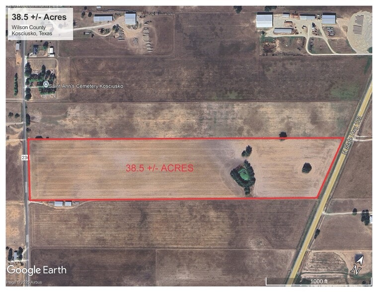 The property consists of a 38.50-acre parcel in Kosciusko, Wilson County, Texas, with frontage on Hwy 123 and CR 236. It lies south of the FM 541 intersection near Pruski’s Service Station. The site has rural zoning and is currently in agricultural use. Public utilities, including water, electric, telephone, and septic, are available. Physical features include a pond and a shallow water well. Access to area roadways connects the site to regional markets and surrounding communities.
