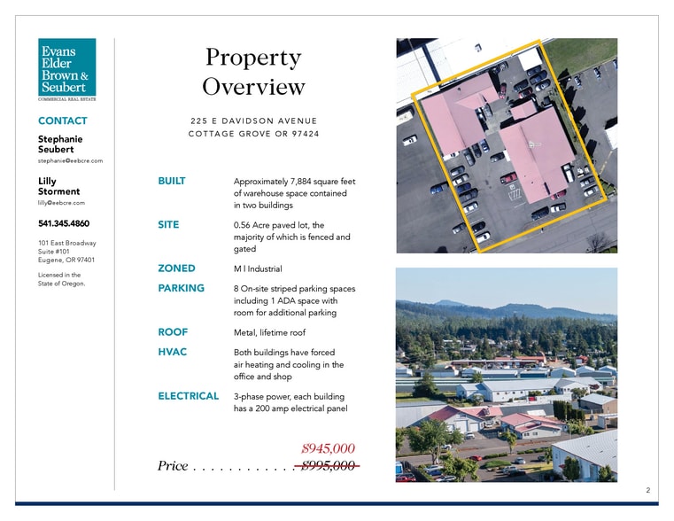 225 E Davidson Ave 7,884 SF Industrial Building Cottage Grove, OR 97424 $1,310,186 CAD ($166.18 CAD/SF)