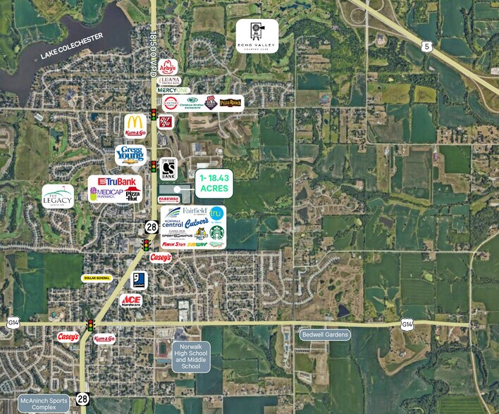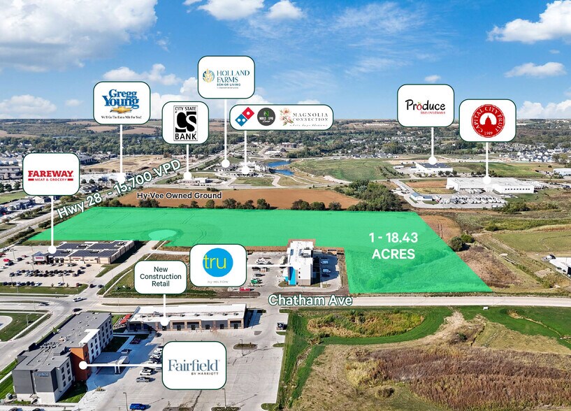 Commercial ground available along Highway 28 in the booming suburb of Norwalk with flexible lot sizes. This prime development land is strategically located at the intersection of Chatham Avenue and Highway 28, offering high visibility and easy access. The area is experiencing significant growth, evidenced by a strong presence of established businesses and ongoing developments including a new Fareway Meat & Grocery, Tru hotel by Hilton, Fairfield by Mariott, Norwalk Central Sports complex, and various supporting retail uses.
