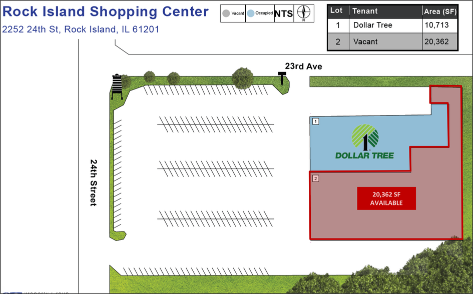 20,362 SF space available in 31,750 SF multi-tenant retail building anchored by Dollar Tree; space can be subdivided. Convenient location on 24th Street in the central Rock Island neighborhood on a corner lot with many businesses, office users & Unity Trinity Point Hospital in the immediate area. Excellent visibility along 24th Street with both pylon and building mounted signage available. Ample parking with approximately 130 +/- spaces and 2 points of ingress/egress, accessible from 23rd Avenue & 24th Avenue.