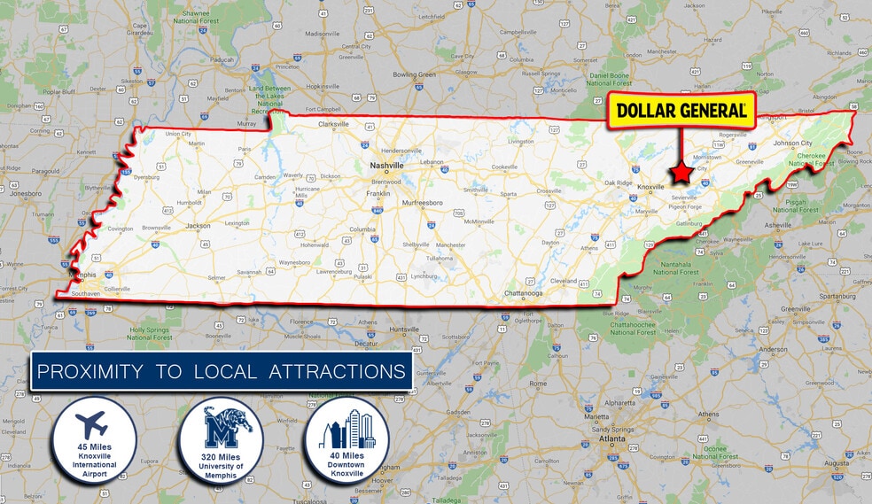 Fortis Net Lease is pleased to present this 9,026 SF Dollar General store located in Morristown, Tennessee. The property is secured with a Fifteen (15) Year Absolute NNN Lease, leaving zero landlord responsibilities. The lease contains 5 (5-year) options to renew, each with a 10% rental rate increase. The lease is corporately guaranteed by Dollar General Corporation, which holds a credit rating of “BBB”, which is classi?ed as Investment Grade. The store, originally opened in 2016, continues to perform exceptionally well. This Dollar General is highly visible as it is strategically positioned on the corner of Enka Hwy and Springvale Rd, which sees over 9,000 cars per day. The ?ve-mile population from the site is 35,254 while the ?ve-mile average household income is $61,118 per year, making this location ideal for a Dollar General. This area is experiencing great growth with the 1-mile population growth rate at 3%. The Subject offering represents an ideal opportunity for a 1031 exchange buyer or a “passive” investor to attain the fee simple ownership of a Dollar General. This investment will offer a new owner continued success due to the ?nancial strength and the proven pro?tability of the tenant, the nation’s top dollar store. List price re?ects a 6.18% cap rate based on NOI of $77,250.