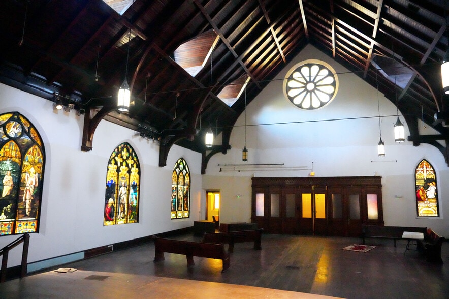 - Historic stone structure with original stained-glass windows and a prominent bell tower.
