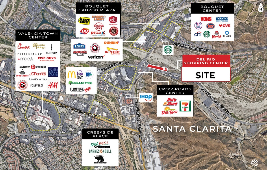 Del Rio Center is an established, well-maintained neighborhood center due to it's great synergy with a mix of tenants which include: Wing Stop, Runners Lane, Edible Arrangements, 76 Gas-Station, California Bakery and Café, and Dozens of Desirable Service-Oriented Retailers . Centrally located in the heart of Valencia at Santa Clarita's busiest signalized intersection with over 100,000 CPD and within minutes to the Golden State I-5 and Antelope Valley SR-14 Fwys. Del Rio offers Easy Ingress/Egress with median breaks along Soledad Canyon Road and superb visibility and frontage alongside Soledad Canyon Road.