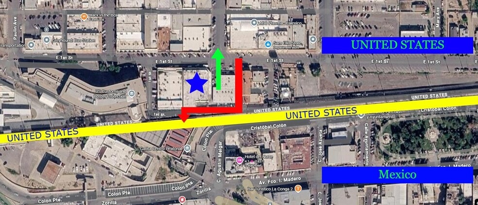 This impressive 20,000 + square foot, two-story building is a prime retail location, situated on the corner of First Street as you enter the U.S. from Mexico. It is the very first building you see, as you enter the USA. it is located in a border-adjacent area, it sees an estimated 50,000 pedestrians crossing daily between Mexicali, Baja California, and Calexico, California. Currently under temporary retail leases, 80% of the space is dedicated to retail use. This exceptional property is perfect for a variety of ventures, as it is a landmark first impression on the border. Given its prime location and high foot traffic, you could consider a convenience store, a quick-service restaurant, a tourist gift shop, a bank or financial service, or even a pharmacy