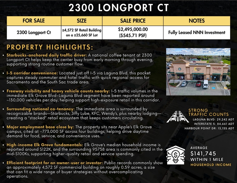Located just off Interstate 5 near Laguna Blvd, the site benefits from strong commuter exposure, surrounding national retailers, nearby hotels, and a major employment base including Apple’s Elk Grove campus. The building size and lot configuration create an efficient, easy-to-manage investment footprint that appeals to both private and exchange buyers seeking stabilized retail income.