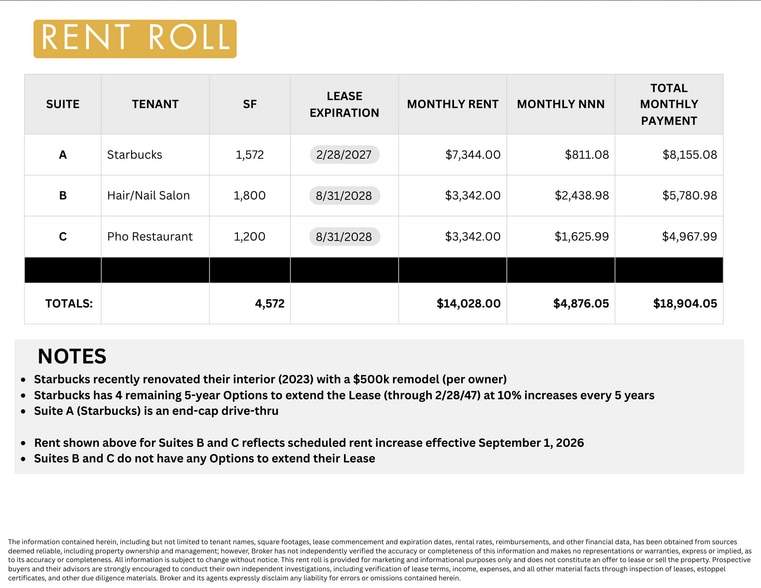 The property is 100% occupied by a complementary mix of national and service-oriented tenants, providing diversified revenue streams and consistent daily customer activity. Starbucks recently completed an estimated $500,000 interior remodel (2023), reinforcing long-term commitment to the location. The Starbucks lease includes four remaining 5-year extension options, potentially extending occupancy through February 2047 with scheduled 10% rental increases every five years.