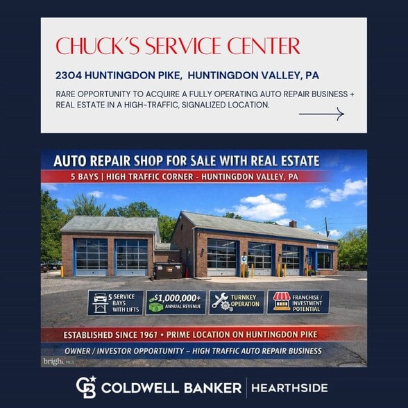 Exceptional opportunity to acquire a long-established, profitable auto repair business with real estate located on highly traveled Huntingdon Pike at the signalized intersection of Welsh Rd & Philmont Avenue in Huntingdon Valley, PA. This high-visibility, high-traffic location offers outstanding exposure for an automotive service business, mechanic shop, or franchise operation.