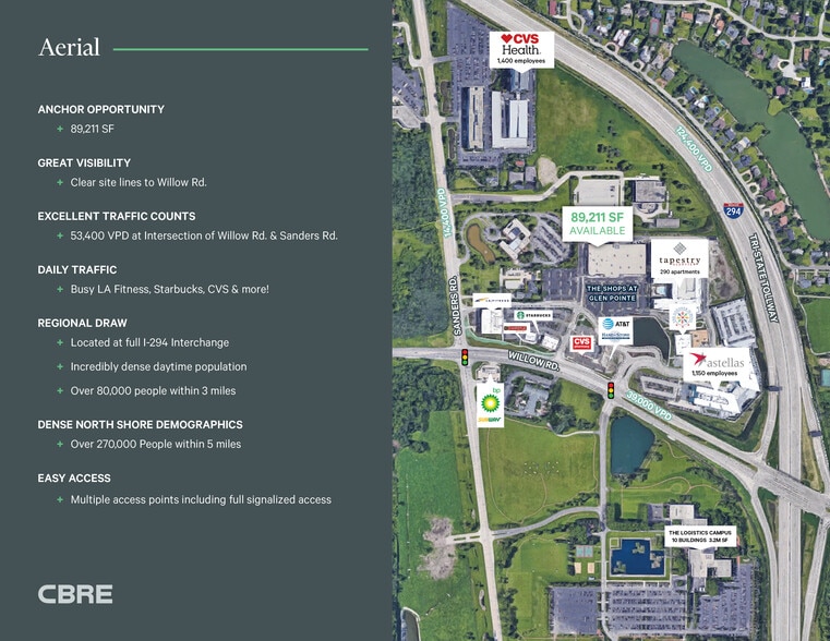 ANCHOR OPPORTUNITY + 89,211 SF GREAT VISIBILITY + Clear site lines to Willow Rd. EXCELLENT TRAFFIC COUNTS + 53,400 VPD at Intersection of Willow Rd. & Sanders Rd. DAILY TRAFFIC + Busy LA Fitness, Starbucks, CVS & more! REGIONAL DRAW + Located at full I-294 Interchange + Incredibly dense daytime population + Over 80,000 people within 3 miles DENSE NORTH SHORE DEMOGRAPHICS + Over 270,000 People within 5 miles EASY ACCESS + Multiple access points including full signalized access