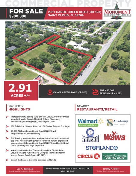 +/- 274 Feet of Fantastic Arterial Roadway Frontage with 16,369 Average Daily Trips (ADT). Only 1.4 Miles (4 Minutes) to Saint Cloud Hospital (Orlando Health), 2.7 Miles (5 Minutes) to Florida's Turnpike, 4.1 Miles (8 Minutes) to Narcoossee Road, and 18.4 Miles (29 Minutes) to Orlando International Airport (MCO). The Property is Entitled with Professional (P) Zoning within the City of Saint Cloud and Permitted Uses include, but are not limited to: Dental; Drugstore; Office; Mail/Parcel Service; Massage; Medical Office; Pharmacy; Place of Worship (Congregation); Restaurant (including QSR); Urgent Care. Conditional Uses include, but are not limited to: ACLF; Bank; Daycare; Gym; Laundromat; Salon; School; Travel Agency. Approximately 2.91 Acres of Vacant Developable Land with a scattered variety of Mature and Majestic Hardwood Trees ideal for select preservation. NO FEMA 100-Year Floodplain identified within the limits of the Property. Paved Access to both Canoe Creek Road and Fertic Road allow for Excellent Interior Vehicle Circulation, Full Turning Movements at Multiple Locations, and an overall Superior Access Configuration that is Highly Sought After. Public Utilities are available along the +/- 274 Feet of Frontage on Canoe Creek Road and available Mobility Fee Credits will convey with the Property. Take advantage of the Numerous Development Opportunities with this Blank Canvas providing Great Visibility and High Exposure in this Rapidly Growing, Heavily Traversed, Residential Corridor. Seller will consider Private Financing for Qualified Buyers