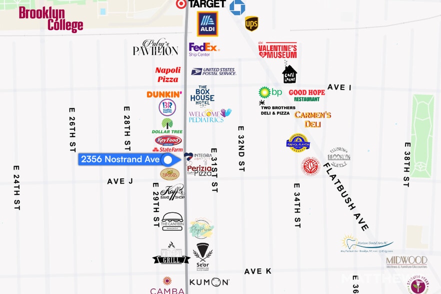 Located at the Flatbush–Nostrand Junction in Brooklyn, NY, this ground-floor retail property offers visibility along a significant transit intersection. The area provides direct access to the 2, 5, Q, and B subway lines and is supported by multiple bus routes. Brooklyn College is situated one block north of the property. Nearby uses include financial services, medical practices, and national retailers. The surrounding neighborhood contains a mix of residential and commercial properties with consistent pedestrian circulation throughout the day.