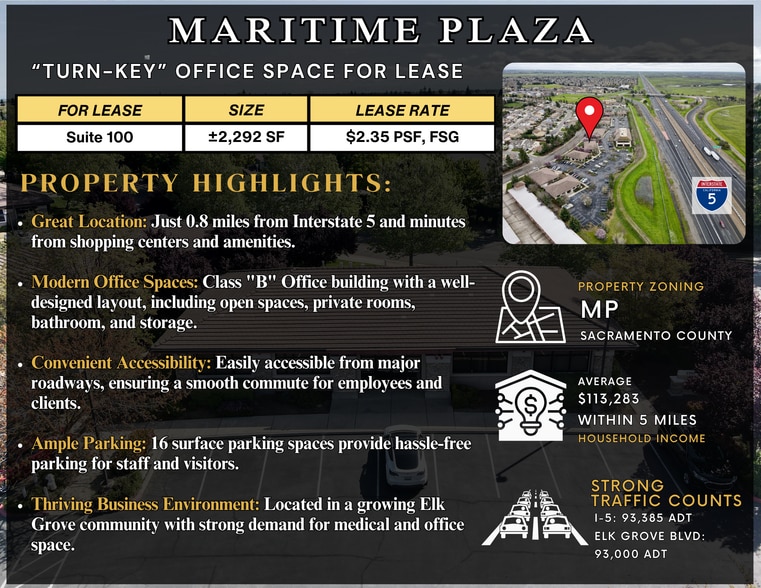 Maritime Plaza offers a rare turn-key opportunity in one of Elk Grove's most active commercial corridors. Suite 100 delivers ±2,292 SF of move-in-ready office space in a well-maintained Class "B" building — thoughtfully laid out with open work areas, private rooms, a bathroom, and storage. At $2.35 PSF on a full-service gross lease, occupancy costs stay predictable and transparent. The location puts your business just 0.8 miles from Interstate 5, with direct access to one of Sacramento County's busiest trade routes — I-5 carries over 93,000 vehicles daily, and Elk Grove Blvd. matches that with another 93,000 ADT. Sixteen dedicated surface parking spaces mean employees and clients never have to circle the lot. The surrounding Elk Grove community continues to grow, with average household incomes topping $113,000 within a five-mile radius — a customer base with real purchasing power. Whether you're a medical practice, professional services firm, or growing business looking to plant roots in a thriving submarket, this suite checks the boxes without the build-out headache.