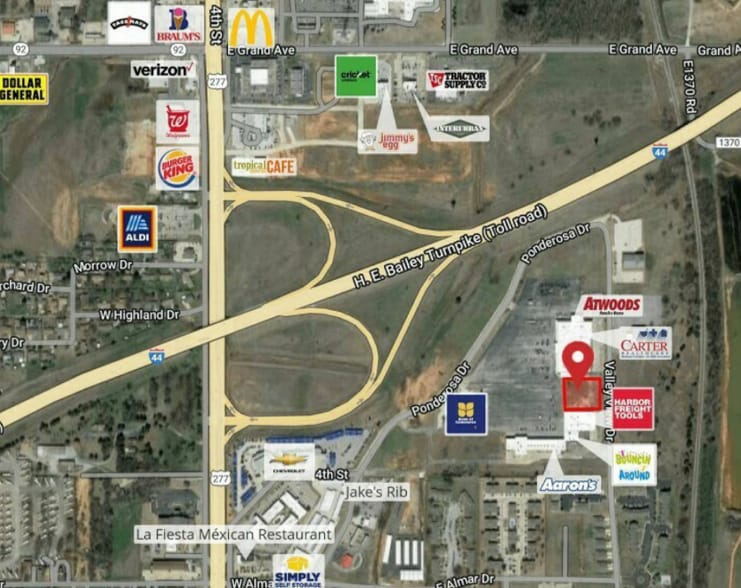 LAND FOR LEASE | 2400 Ponderosa Dr, Chickasha, OK 73018 1.25 acres of prime commercial land for lease at 2400 Ponderosa Drive in Chickasha, Oklahoma. This fully improved pad site sits within the Chickasha Square retail corridor, one of the highest-traffic commercial areas in south-central Chickasha. SITE OVERVIEW This 54,450 SF (1.25 AC) lot is a cleared, pad-ready site with all utilities in place. The land previously supported a 12,000 SF retail building, so infrastructure including water, sewer, electric, and gas are already in place. The site offers a flat, buildable surface ready for ground-up development or temporary commercial use. LOCATION ADVANTAGES 2400 Ponderosa Drive benefits from direct frontage along the Chickasha Square shopping corridor with strong co-tenancy from national retailers including Atwoods, Aaron's, and Harbor Freight Tools. The site has excellent visibility from Interstate 44 and convenient access from Highway 277 via the signalized intersection at W Almar Drive. Daily traffic counts along this corridor support consistent customer flow for retail, restaurant, and service-oriented tenants. LEASE OR PURCHASE The site can accommodate a variety of commercial uses including retail pad development, restaurant or drive-through construction, automotive services, or other commercial ventures requiring high-visibility land in an established retail area. IDEAL USES Retail pad site development, restaurant or quick-service build-to-suit, automotive service center, medical or professional office, or any commercial use benefiting from I-44 visibility and strong retail co-tenancy. Contact SALT Commercial Real Estate for site plans and additional details.