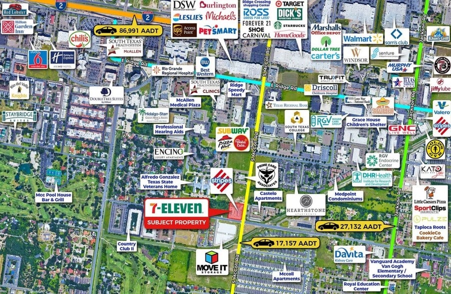 Strategically located at the hard-corner, signalized intersection of S. McColl Road and E. Yuma Avenue, the site benefits from exceptional visibility and convenient access. The property is surrounded by key regional drivers, including McAllen International Airport, La Plaza Mall—South Texas’ premier shopping destination with more than 184 retailers—and South Texas Health System, a 441-bed medical facility. The immediate area is supported by a dense residential population, with nearby apartment communities such as Stonewood Domit Apartments, Mosaic Lofts, Avanti Legacy, Villa Regale, and Mirabella Apartments generating steady daily foot traffic. Additionally, South Texas College (26,000+ enrolled students) and Rio Grande Valley College further enhance the area’s daytime population and demand for essential retail.