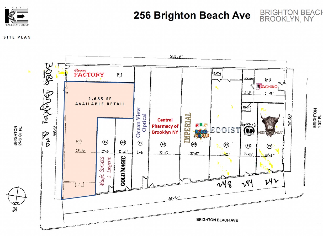 Location: SW Corner of Brighton Beach Ave & Brighton 2nd Street Ground Floor: 2,685 sf Basement: 1,000 sf Ceiling: 12.5 ft Frontage: 23 ft on Brighton Beach Ave; 99 ft on Brighton 1st Pl Highlights: • Corner retail space located on highly trafficked Brighton Beach Ave. • Large basement for additional storage. • Landlord’s Work and Tenant Improvement Allowance available for qualified groups. • B train located two blocks West at Ocean Parkway station with 744,994 annual ridership (2023). • B, Q trains located four blocks East at Brighton Beach station with 2.635mm annual ridership. • B1 & B16 MTA buses service the immediate area.