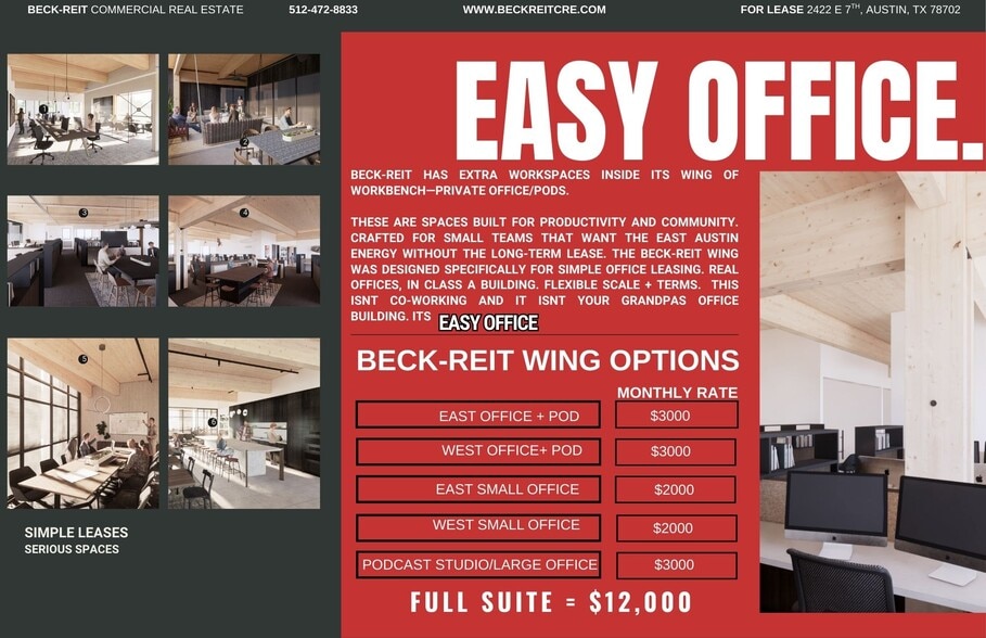 EASY Office at Workbench offers flexible 3rd-floor office suites in one of East Austin’s most dynamic new Class A buildings. Located inside Workbench at 2422 E 7th Street, these offices were designed specifically for small businesses, creative teams, AEC professionals, and growing companies that want a private office—not co-working—but still value community, collaboration, and walkability. The 3rd floor features a floating raised-floor system, offering acoustic comfort, flexible layout options, and personal temperature control—extremely rare for Austin office product. Multiple shared conference rooms, communal patios, kitchenettes, and collaboration zones make this a workspace that improves culture, connection, and productivity. Flexible lease terms (1–3 years), startup-friendly review, and move-in-ready options make EASY Office one of the most accessible Class A office offerings in East Austin. Suites can be leased individually or combined for larger footprints. EASY MONEY FOR TENANT REP = 1 Yr Lease - 1 Month Rent Commission AVAILABLE SUITES & RATES (GROSS LEASES) - East Office + Pod – $3,000 / month - West Office + Pod – $3,000 / month Private office with adjacent semi-open pod for team workflows and client meetings. - - East Small Office – $2,000 / month - - West Small Office – $2,000 / month - - Podcast Studio / Large Office – $3,000 / month Can be used as private office, production space, or content studio. FULL SUITE OPTION – $12,000 / month Lease multiple adjacent offices for teams needing 1,500–2,000+ SF. Additional 3rd floor suites: L3-A: 1,986 SF L3-D: 590 SF (Suites can be combined for expanded footprint.) PROPERTY OVERVIEW – WORKBENCH Workbench is a 48,000 SF, four-story mass timber creative office property in the heart of East Austin. The building features exposed timber, polished concrete, natural light, structured parking, and amenities designed for connection: patios, kitchens, conference rooms, huddle areas, and event space. The **Beck-Reit Wing** on the 3rd floor is uniquely designed for smaller professional teams who want Class A space without long commitments or complex leases. This is not co-working—and not traditional long-term office. It's EASY Office: simple leases, serious spaces. LOCATION – EAST AUSTIN DEVELOPMENT HUB More than 50% of Austin’s development permits since 2020 have occurred east of I-35. This is where Austin builds, where Austin lives, and where Austin’s next generation of talent wants to be. Walk Score + Bike Score in the 90s. Steps to restaurants, bars, coffee shops, bike lanes, and the light rail. 4,400 apartment units within 1.5 miles, creating a LIVE-WORK-PLAY ecosystem unmatched anywhere else in the city. Nearby destinations include Franklin Barbecue, Suerte, Birdie’s, Kinda Tropical, Cenote, Oddwood Brewing, Whisler’s, La Barbecue, and dozens more. Minutes from: • Downtown Austin • University of Texas • Austin-Bergstrom Airport • Tesla Gigafactory • Domain Northside AMENITIES & BUILDING FEATURES • Mass Timber construction (Class A) • Floating raised floors for comfort + flexibility • Five shared conference rooms • Multiple kitchenettes + coffee bars • Two covered patios + one uncovered patio • Huddle spaces + breakout zones • Secured access, structured parking (95 stalls) • Flexible layouts + short-term leases • Startup-friendly application process • Community events, workshops, and East Austin Coffee meetups • On-site podcast studio for content creation and visibility • Designed for AEC, design, tech, finance, PR, and small creative firms ONE-STOP SHOP FOR DEVELOPERS The building hosts companies across architecture, engineering, construction, design, real estate, consulting, branding, and content creation—allowing tenants to collaborate, refer business, and grow through proximity. This is where deals happen in the halls, kitchens, patios, and shared spaces. PODCAST STUDIO ON SITE Tenants enjoy unique proximity to a professional podcast studio used by Boom ATX and community leaders. This offers exposure opportunities for: • interviews • partnerships • brand storytelling • visibility within the East Austin ecosystem A rare amenity in Class A office—ideal for teams leveraging media and marketing. ADDITIONAL SPACES AVAILABLE (RESTAURANT + 4TH FLOOR OFFICE) In addition to 3rd floor EASY Office suites, Workbench also offers: 1st Floor Restaurant Space (±6,144 SF + patios) Hard-corner location with exceptional visibility, patio space, and walkability. *Contact us for details.* 4th Floor Creative Office (±6,682 SF + private patio) Full-floor opportunity with mass timber ceilings, incredible natural light, and private outdoor space. *Contact AQUILA for tour and pricing.* CONTACT FOR 3rd FLOOR DeLea Becker – [delea@beckreit.com](mailto:delea@beckreit.com) Michelle Anderson – [michelle@beckreitcre.com](mailto:michelle@beckreitcre.com) Beck-Reit Commercial Real Estate www.beckreitcre.com Need Small Office faster than February? - we have 1101 6th A2 - small office available 12/1/25 www.beckreitcre.com/1101-e-6th